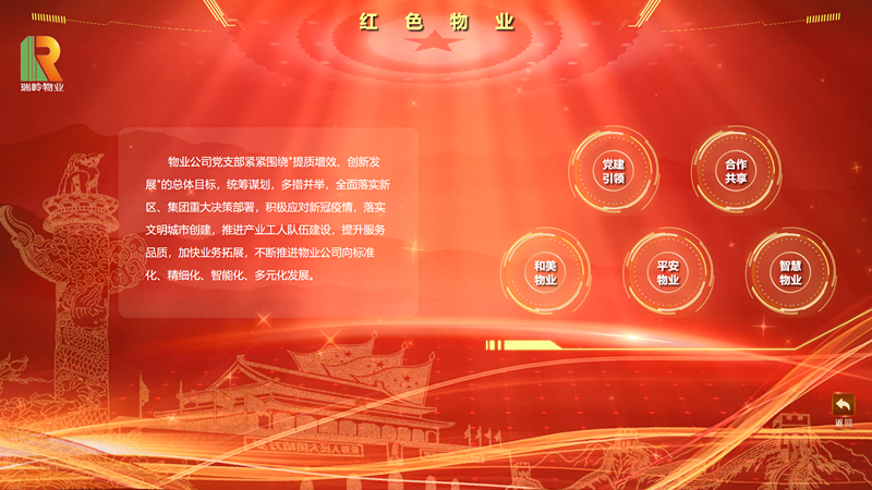 瑞岭物业智慧党建融平台包括红色物业、党史学习教育、学习平台三大模块,其中红色物业包括党建引领、合作共享、和美物业、平安物业、智慧物业五部分内容。平台不仅能实现三会一课端口化学习、“无纸化”党建办公,同时将线下党建活动记录及相关材料作线上展示,辅助资料归档管理。