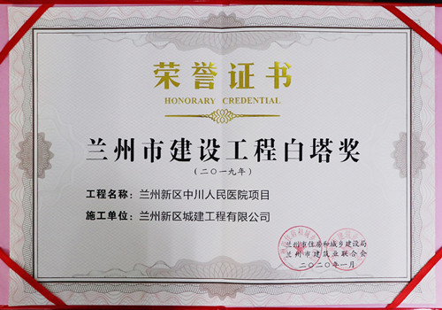 喜讯!继火家湾安置房项目周边基础设施配套一期工程等2个项目获评省级“绿色工地”后,1月16日,从兰州市建筑业联合会第五届理事会第五次理事会议暨2019年度兰州市建设工程“白塔奖”颁奖现场传来喜讯,由城建公司施工的兰州新区中川人民医院项目荣获2019年度兰州市建设工程“白塔奖”。