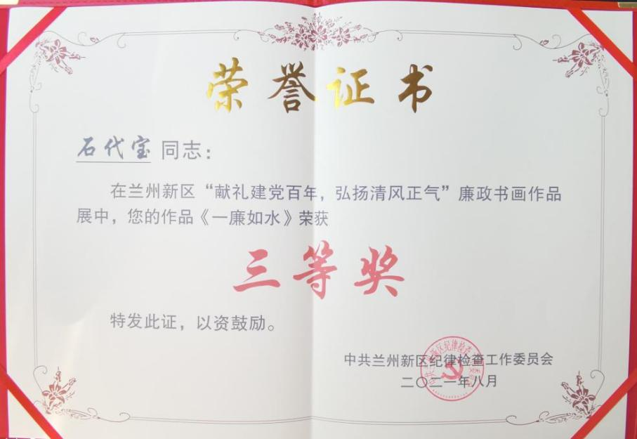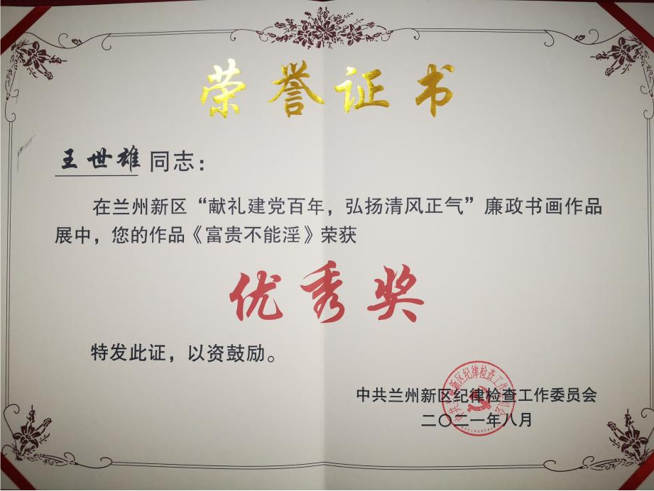 在庆祝中国共产党百年华诞之际,由兰州新区纪工委主办、MG电子 承办的“献礼建党百年,弘扬清风正气”廉政书画作品展自举办以来,得到了新区广大干部群众的积极响应。在8月20日举办的作品评选活动中,MG电子 党委荣获“优秀组织奖”,MG电子职工石代宝剪纸作品《一廉如水》荣获“三等奖”,王世雄书法作品《富贵不能淫》荣获“优秀奖”,同时,还有10名职工获得入围奖。