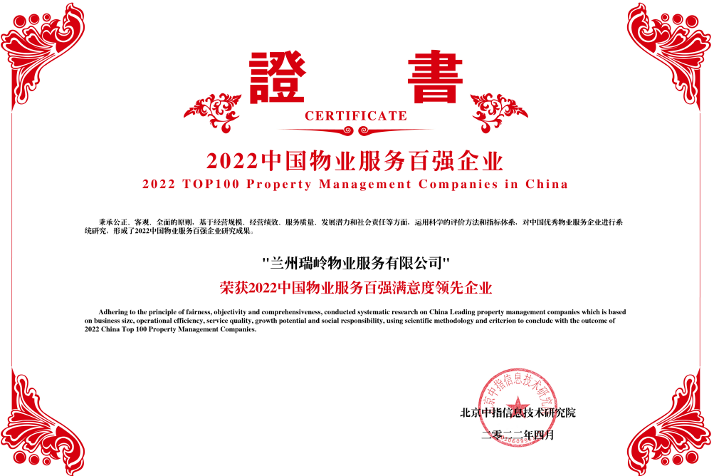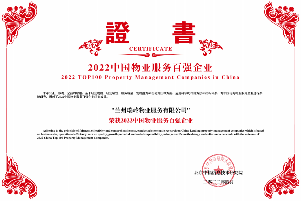 瑞岭物业荣获“2022中国物业服务百强MG电子
