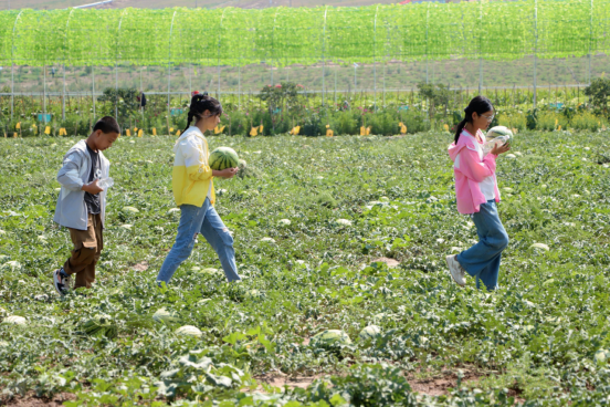 来到现代农业田园,大家在观景台上游目骋怀,观赏新康新村与绿色原野交织的城市风光,认真聆听结对干部讲述十二年间,兰州新区从土丘荒坡成长为现代化产业新城的蝶变过程。在萌宠乐园,孩子们放下学习的压力,与小动物们亲密接触,了解不同动物的生活习性和特征。在向阳花田和采摘园,孩子们走进西瓜田,有的蹲下来仔细观察西瓜的颜色和花纹,有的用手轻轻拍打西瓜,听声音判断西瓜是否成熟,没一会儿,大家都找到了自己的“梦中情瓜”,他们手捧沉甸甸的西瓜,脸上洋溢着幸福的笑容。