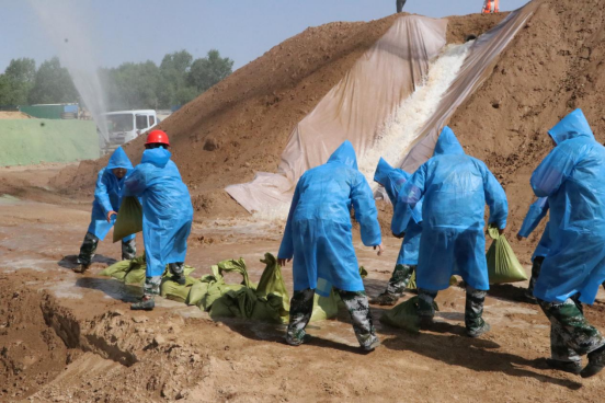 实战演练紧密贴合市政工程施工高风险点,精心设置了物体打击事故和突发洪涝灾害两类突发事故场景:上午9时36分,经十二路项目管道吊装现场突发意外,一根直径1.6米的混凝土管道因钢丝绳滑脱滚落边坡,将一名沟底作业人员埋压,现场安全员发现后立即呼救并上报。相关负责人迅速研判并启动应急预案。抢险救援组火速携带工具抵达,在技术处置组确认安全后,联合物资保障组使用挖掘机协同人力快速清除障碍、救出伤员;医疗救护组立即进行创口清洗、止血包扎等急救;警戒疏散组同步设置警戒线、清场并引导救护车快速进场。上午9时55分,模拟新区突降暴雨,大量雨水汇集冲毁管沟截水墙,倒灌风险巨大。安全巡查员发现险情上报后,应急预案再次启动。抢险救援组、物资保障组迅速响应,扛沙袋筑堤、调用挖掘机开挖引流渠、架设水泵抽排积水,警戒疏散组巡查并铺设临时通道,多组协同成功化解管沟被淹危机。整个演练过程紧张有序,各小组分工明确、配合默契,高效完成了各项预定任务,演练达到了预期效果。