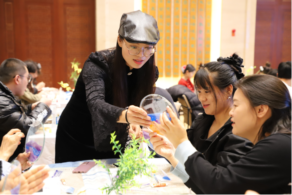 活动精选螺钿胸针、烧箔画、流沙画、掐丝珐琅四项技艺,特邀新区创业工坊的讲师从历史渊源、制作工艺、色彩搭配等方面进行细致讲解,并示范操作技巧。职工们认真投入制作,螺钿片经剪贴打磨化为莹润胸针,金箔银箔在画板上晕染成景,彩沙在玻璃框内流转成画,掐丝填彩凝成精巧珐琅作品。全程气氛温馨而热烈,大家将自己精心制作的“艺术品”捧在手心,互相欣赏、展示,每个人的脸上都洋溢着自豪与喜悦。