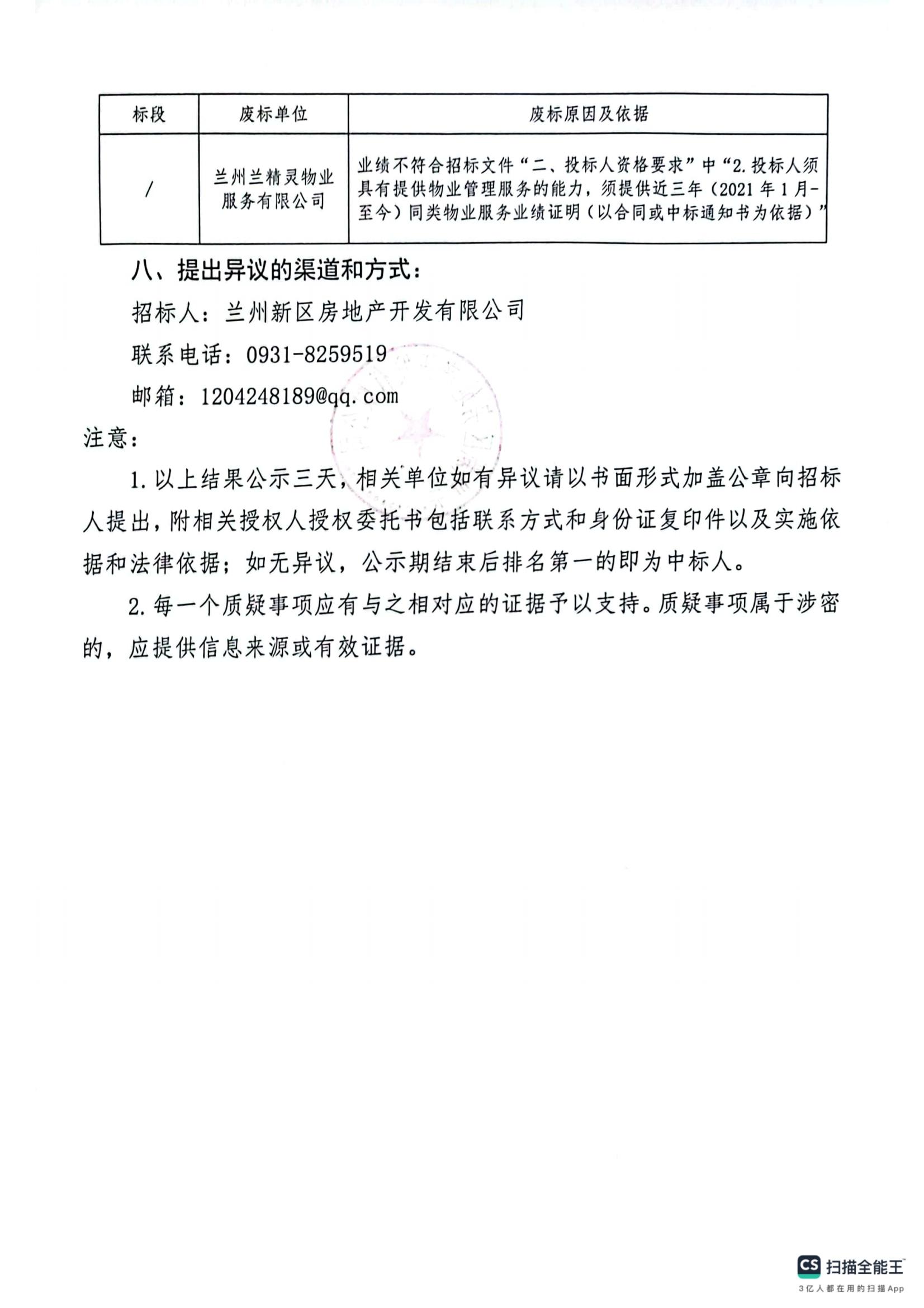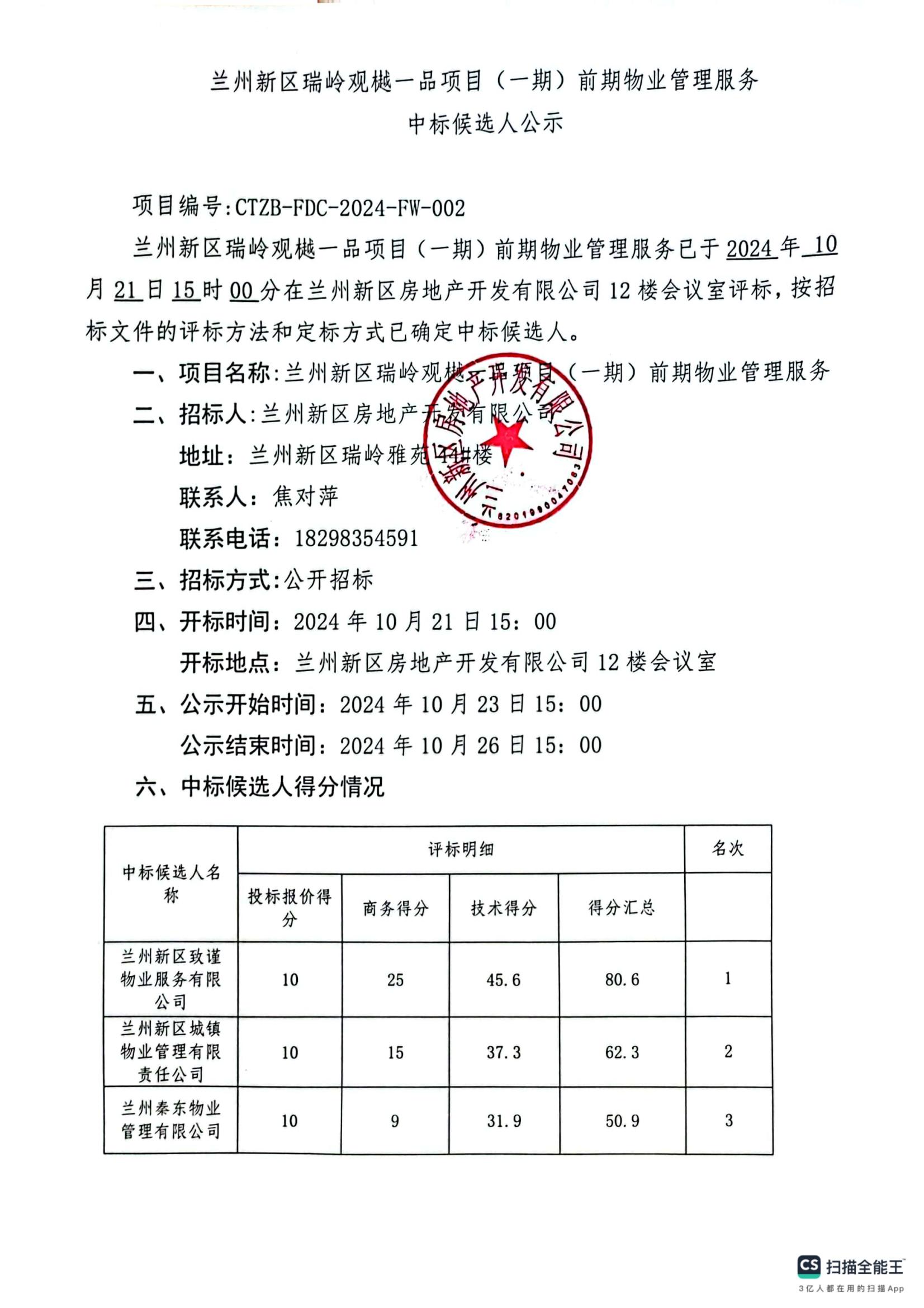 兰州新区瑞岭观樾一品项目(一期)前期物业管理服务中标候选人公示