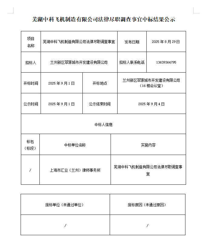 芜湖中科飞机制造有限公司尽职调查事宜中标结果公示