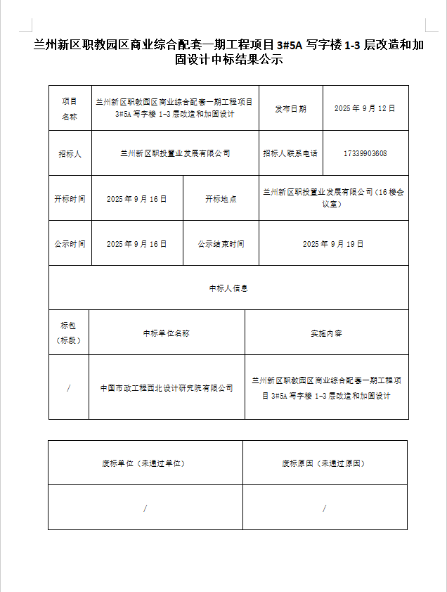 兰州新区职教园区商业综合配套一期工程项目3#5A写字楼1-3层改造和加固设计的中标公示
